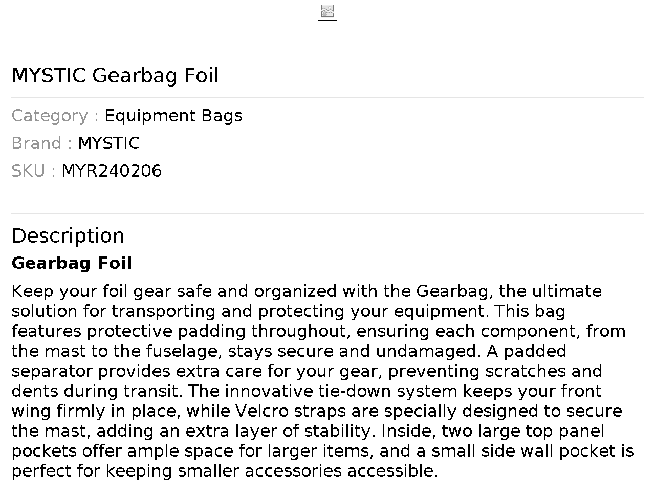 Keep your foil gear safe and organized with the Gearbag, the ultimate solution for transporting and protecting your equipment. This bag features protective padding throughout, ensuring each component, from the mast to the fuselage, stays secure and undamaged. A padded separator provides extra care for your gear, preventing scratches and dents during transit. The innovative tie-down system keeps your front wing firmly in place, while Velcro straps are specially designed to secure the mast, adding an extra layer of stability. Inside, two large top panel pockets offer ample space for larger items, and a small side wall pocket is perfect for keeping smaller accessories accessible.
