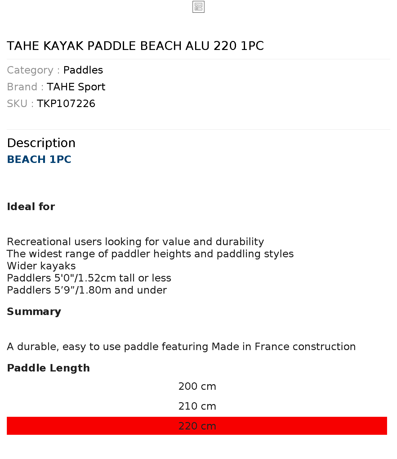 TAHE KAYAK PADDLE BEACH ALU 220 1PC