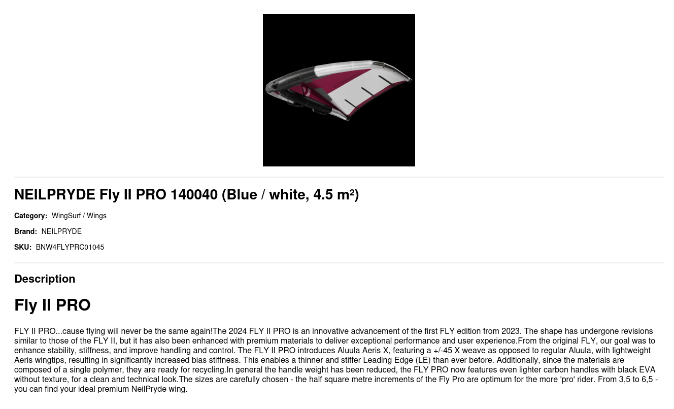 FLY II PRO...cause flying will never be the same again!The 2024 FLY II PRO is an innovative advancement of the first FLY edition from 2023. The shape has undergone revisions similar to those of the FLY II, but it has also been enhanced with premium materials to deliver exceptional performance and user experience.From the original FLY, our goal was to enhance stability, stiffness, and improve handling and control. The FLY II PRO introduces Aluula Aeris X, featuring a +/-45 X weave as opposed to regular Aluula, with lightweight Aeris wingtips, resulting in significantly increased bias stiffness. This enables a thinner and stiffer Leading Edge (LE) than ever before. Additionally, since the materials are composed of a single polymer, they are ready for recycling.In general the handle weight has been reduced, the FLY PRO now features even lighter carbon handles with black EVA without texture, for a clean and technical look.The sizes are carefully chosen - the half square metre increments of the Fly Pro are optimum for the more 'pro' rider. From 3,5 to 6,5 - you can find your ideal premium NeilPryde wing.