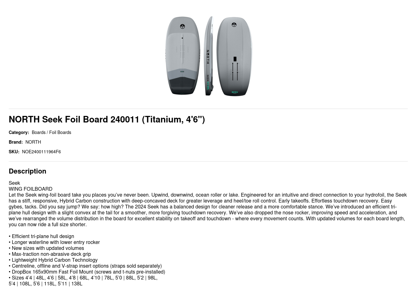 Let the Seek wing-foil board take you places you’ve never been. Upwind, downwind, ocean roller or lake. Engineered for an intuitive and direct connection to your hydrofoil, the Seek has a stiff, responsive, Hybrid Carbon construction with deep-concaved deck for greater leverage and heel/toe roll control. Early takeoffs. Effortless touchdown recovery. Easy gybes, tacks. Did you say jump? We say: how high? The 2024 Seek has a balanced design for cleaner release and a more comfortable stance. We’ve introduced an efficient tri-plane hull design with a slight convex at the tail for a smoother, more forgiving touchdown recovery. We’ve also dropped the nose rocker, improving speed and acceleration, and we’ve rearranged the volume distribution in the board for excellent stability on takeoff and touchdown - where every movement counts. With updated volumes for each board length, you can now ride a full size shorter.
