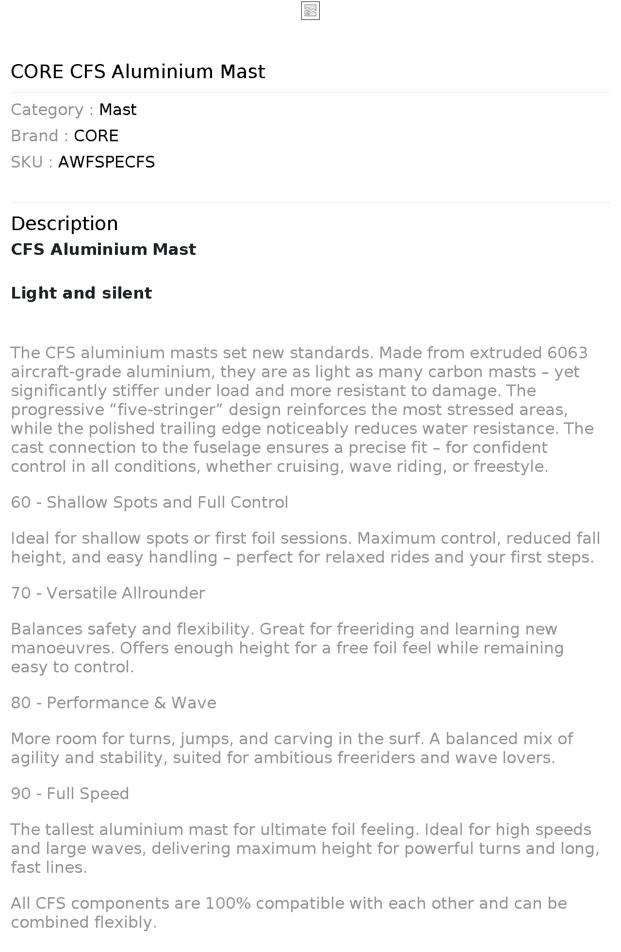 The CFS aluminium masts set new standards. Made from extruded 6063 aircraft-grade aluminium, they are as light as many carbon masts – yet significantly stiffer under load and more resistant to damage. The progressive “five-stringer” design reinforces the most stressed areas, while the polished trailing edge noticeably reduces water resistance. The cast connection to the fuselage ensures a precise fit – for confident control in all conditions, whether cruising, wave riding, or freestyle.