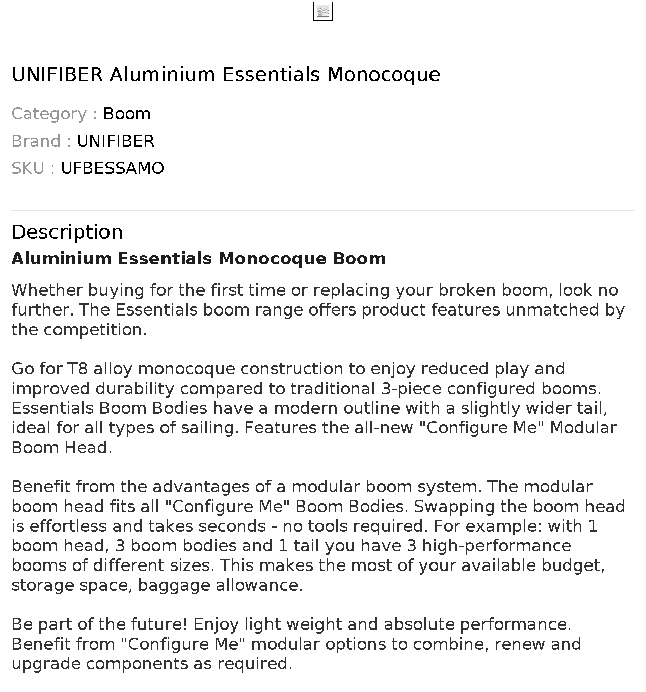 Go for T8 alloy monocoque construction to enjoy reduced play and improved durability compared to traditional 3-piece configured booms. Essentials Boom Bodies have a modern outline with a slightly wider tail, ideal for all types of sailing. Features the all-new "Configure Me" Modular Boom Head.