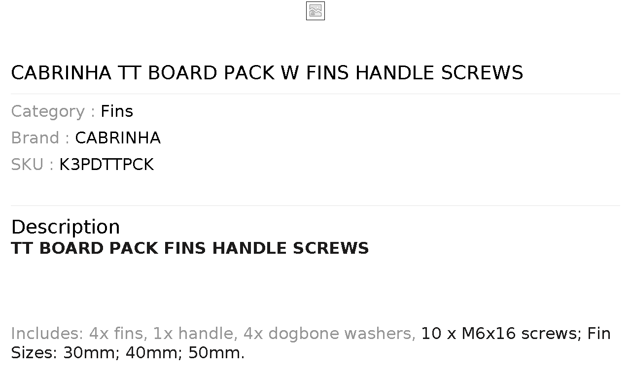 Includes: 4x fins, 1x handle, 4x dogbone washers, 10 x M6x16 screws; Fin Sizes: 30mm; 40mm; 50mm.