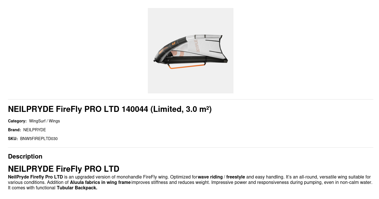 NeilPryde Firefly Pro LTD is an upgraded version of monohandle FireFly wing. Optimized for wave riding / freestyle and easy handling. It’s an all-round, versatile wing suitable for various conditions. Addition of Aluula fabrics in wing frame improves stiffness and reduces weight. Impressive power and responsiveness during pumping, even in non-calm water. It comes with functional Tubular Backpack.