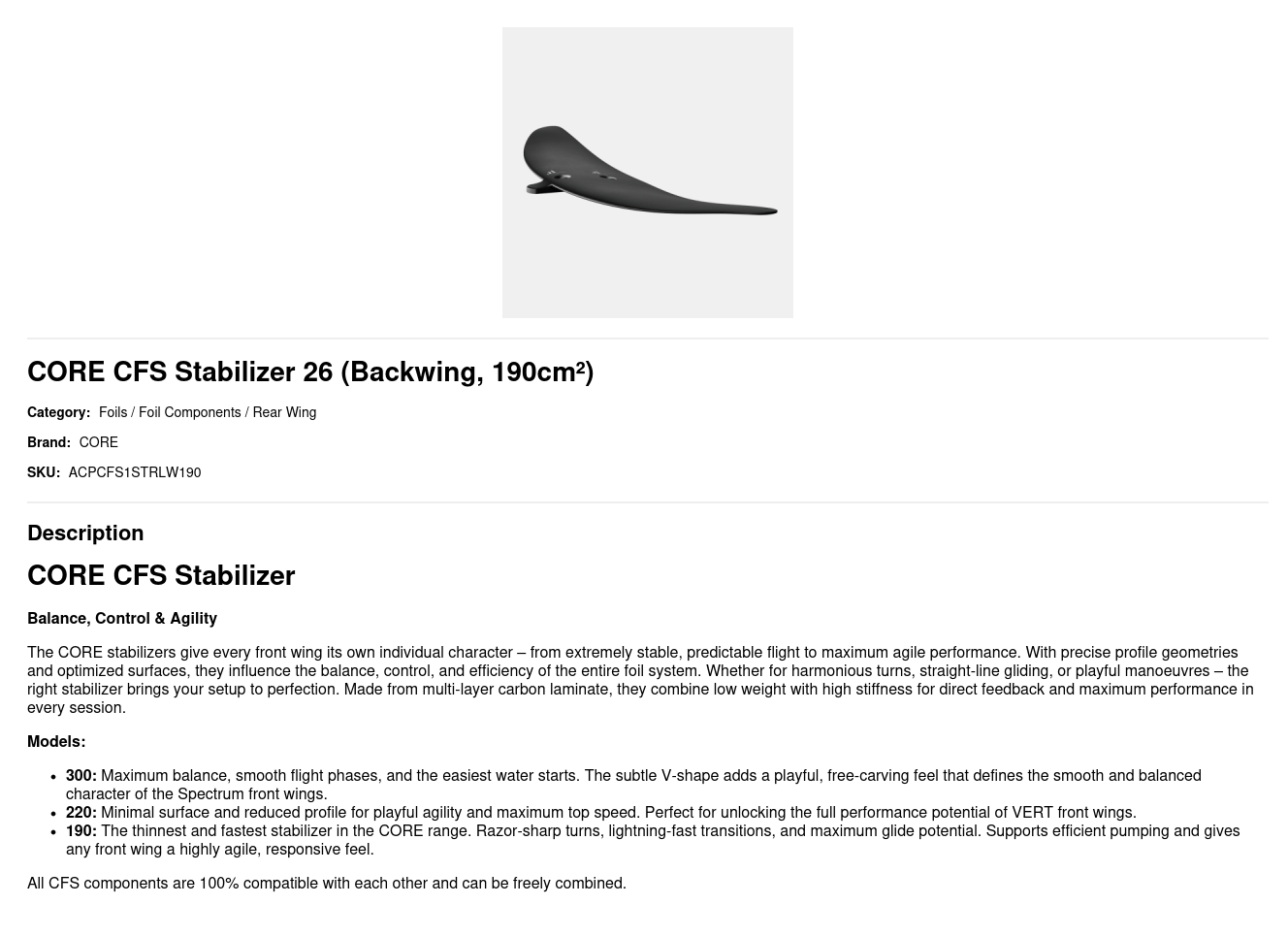 - 190: The thinnest and fastest stabilizer in the CORE range. Razor-sharp turns, lightning-fast transitions, and maximum glide potential. Supports efficient pumping and gives any front wing a highly agile, responsive feel.