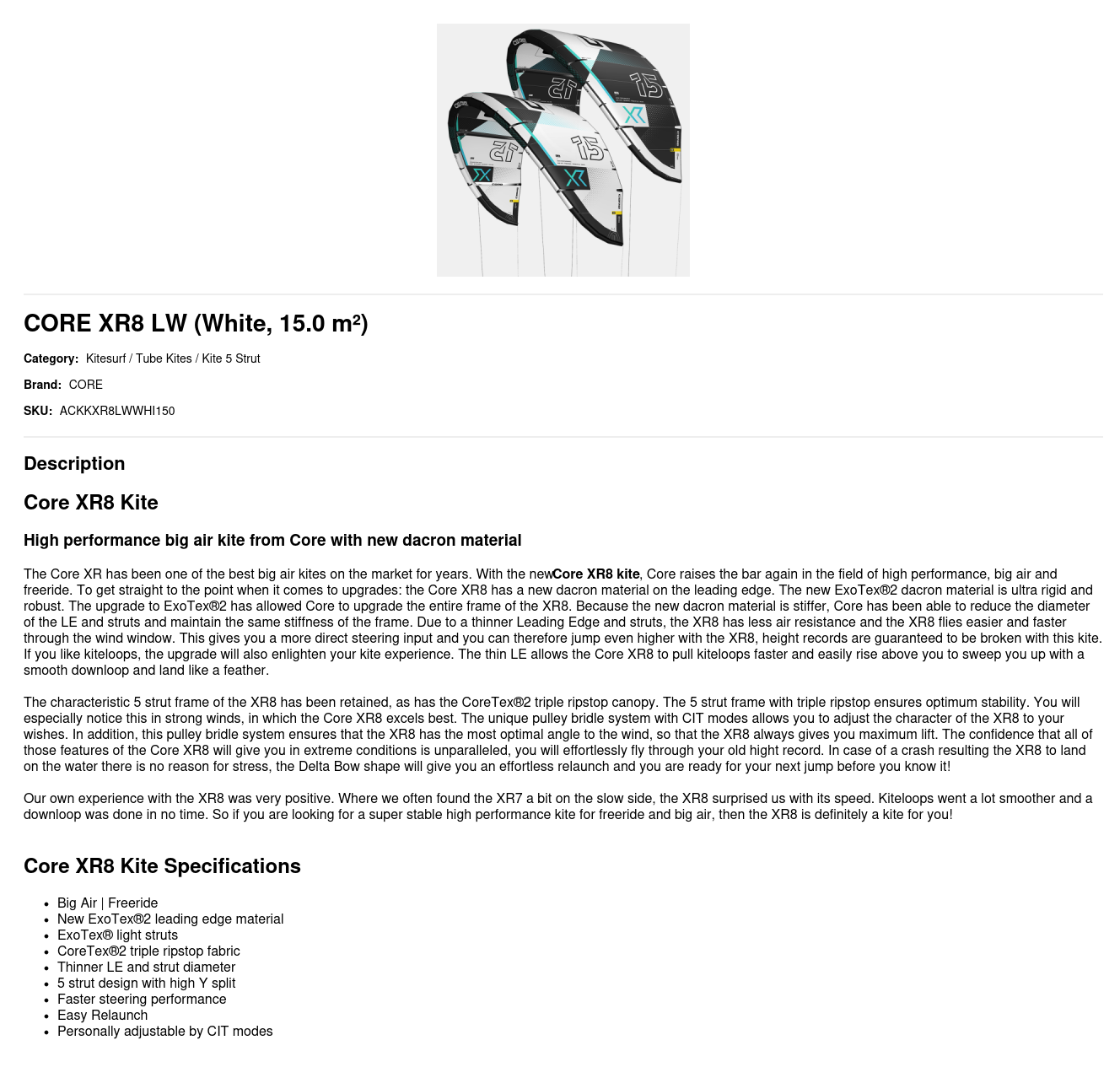 Core XR8 Kite Specifications