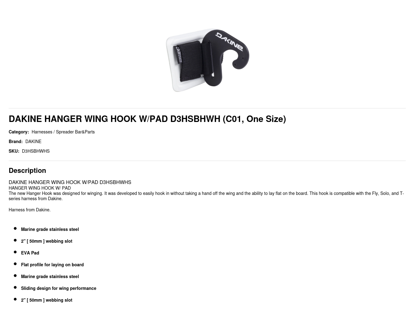 DAKINE HANGER WING HOOK W/PAD D3HSBHWH