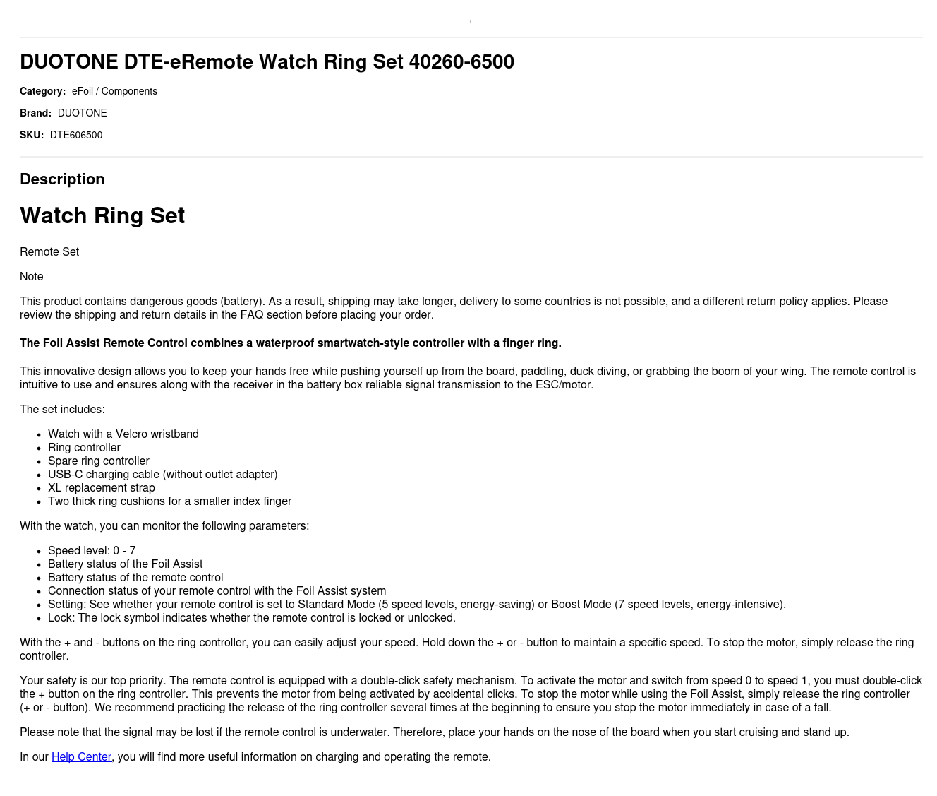 Your safety is our top priority. The remote control is equipped with a double-click safety mechanism. To activate the motor and switch from speed 0 to speed 1, you must double-click the + button on the ring controller. This prevents the motor from being activated by accidental clicks. To stop the motor while using the Foil Assist, simply release the ring controller (+ or - button). We recommend practicing the release of the ring controller several times at the beginning to ensure you stop the motor immediately in case of a fall.
