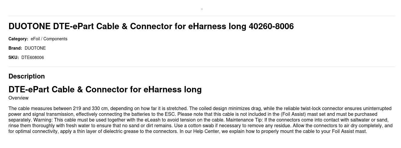 The cable measures between 219 and 330 cm, depending on how far it is stretched. The coiled design minimizes drag, while the reliable twist-lock connector ensures uninterrupted power and signal transmission, effectively connecting the batteries to the ESC. Please note that this cable is not included in the (Foil Assist) mast set and must be purchased separately. Warning: This cable must be used together with the eLeash to avoid tension on the cable. Maintenance Tip: If the connectors come into contact with saltwater or sand, rinse them thoroughly with fresh water to ensure that no sand or dirt remains. Use a cotton swab if necessary to remove any residue. Allow the connectors to air dry completely, and for optimal connectivity, apply a thin layer of dielectric grease to the connectors. In our Help Center, we explain how to properly mount the cable to your Foil Assist mast.