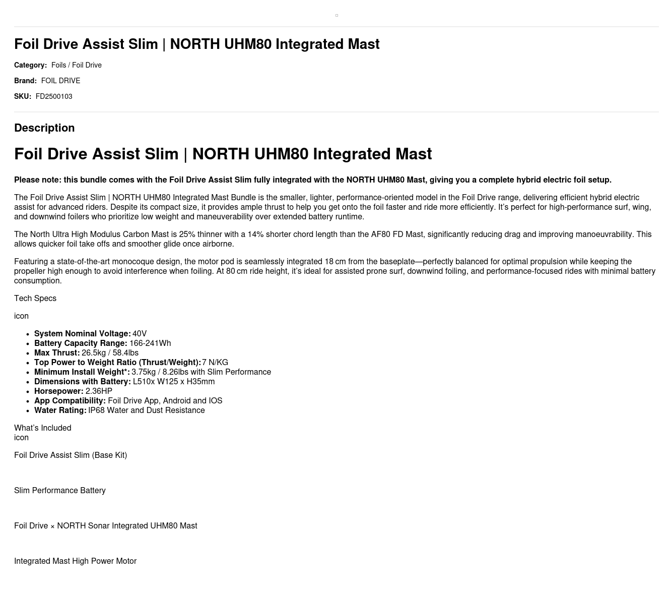Please note: this bundle comes with the Foil Drive Assist Slim fully integrated with the NORTH UHM80 Mast, giving you a complete hybrid electric foil setup.