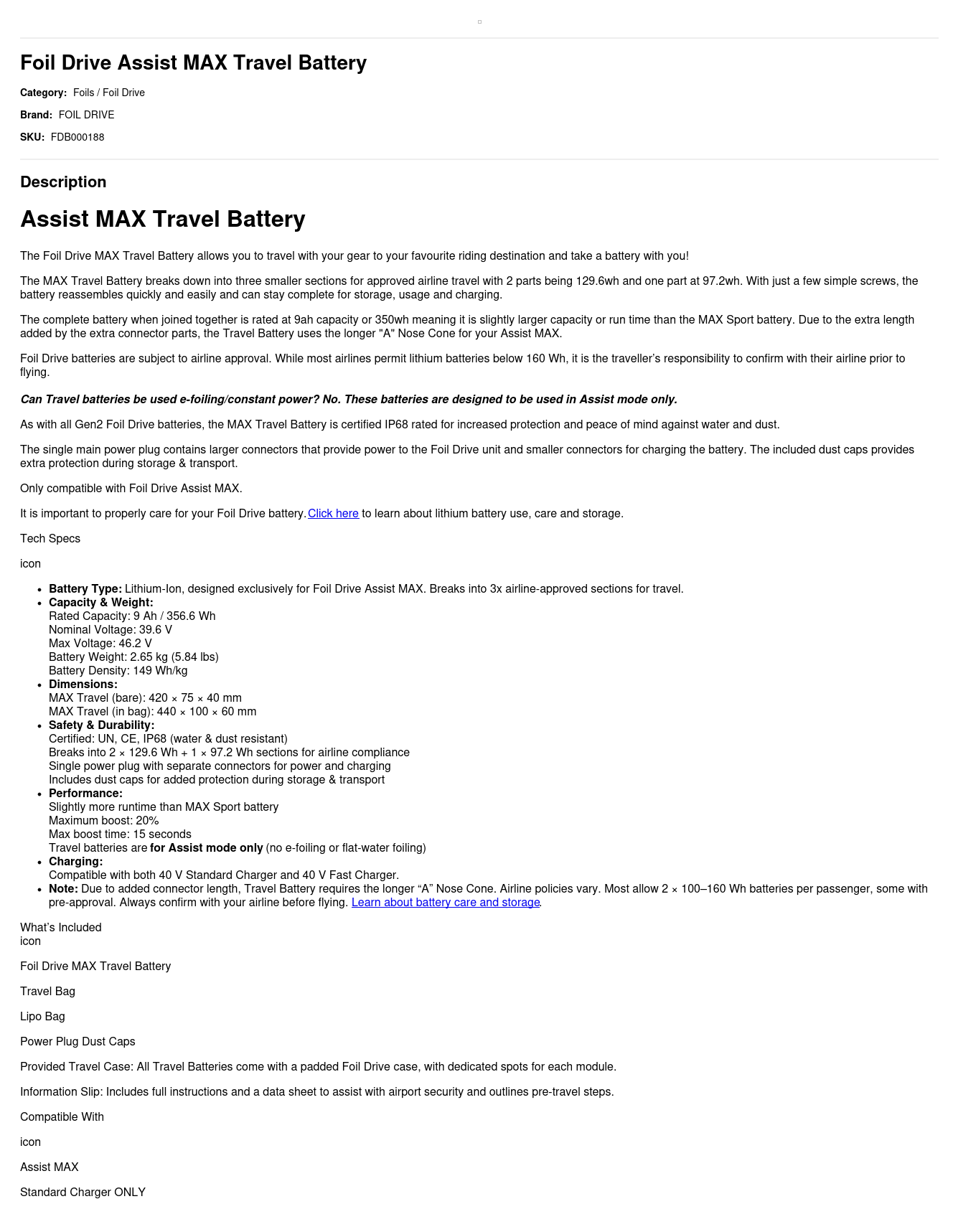 - Battery Type: Lithium-Ion, designed exclusively for Foil Drive Assist MAX. Breaks into 3x airline-approved sections for travel.