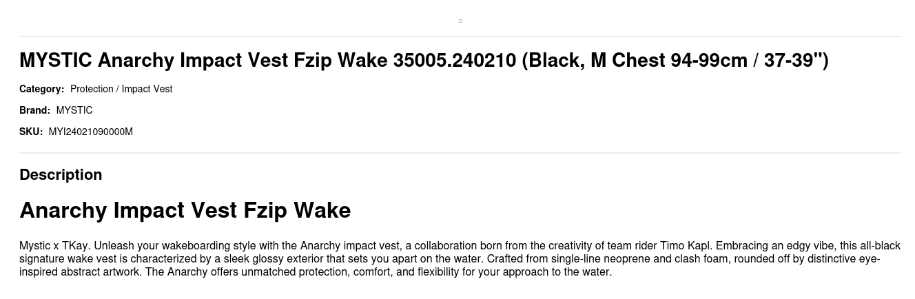 Mystic x TKay. Unleash your wakeboarding style with the Anarchy impact vest, a collaboration born from the creativity of team rider Timo Kapl. Embracing an edgy vibe, this all-black signature wake vest is characterized by a sleek glossy exterior that sets you apart on the water. Crafted from single-line neoprene and clash foam, rounded off by distinctive eye-inspired abstract artwork. The Anarchy offers unmatched protection, comfort, and flexibility for your approach to the water.