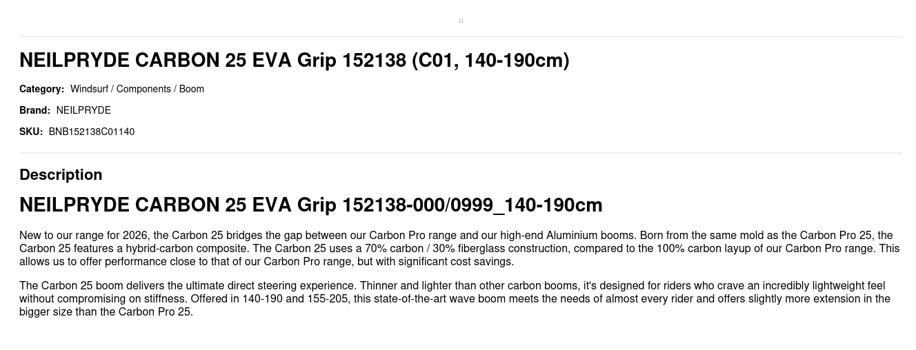 The Carbon 25 boom delivers the ultimate direct steering experience. Thinner and lighter than other carbon booms, it's designed for riders who crave an incredibly lightweight feel without compromising on stiffness. Offered in 140-190 and 155-205, this state-of-the-art wave boom meets the needs of almost every rider and offers slightly more extension in the bigger size than the Carbon Pro 25.