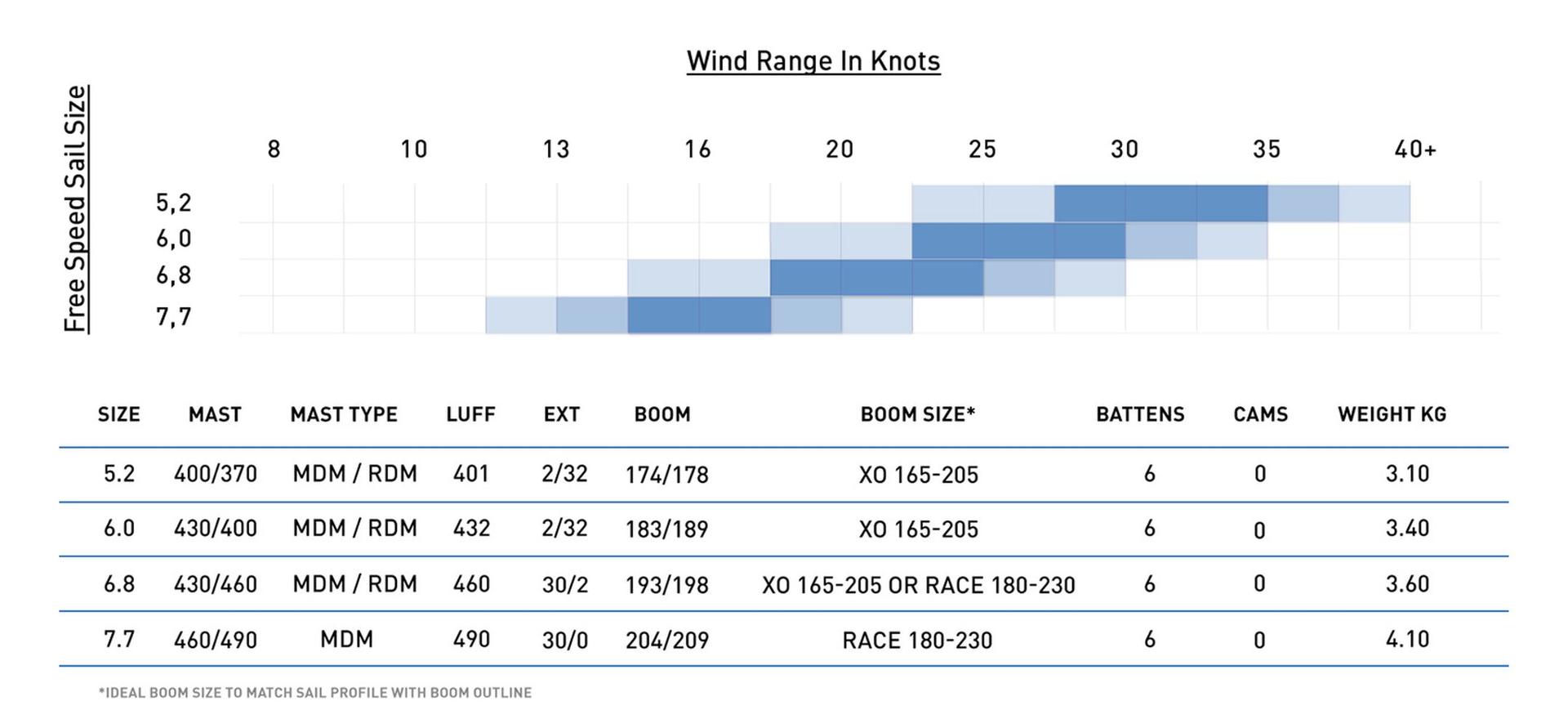 North Sail's new FreeSpeed is very close in design profile to the Slalom Race sail, yet pushes the "accessible performance" combination to its maximum, at both ends of the scale. Speed can really be had easily and effortlessly. To enhance performance by leveraging the full benefits of 3Di shaping, we are able to build impressive stability, acceleration and drive in a no-cam sail. The sail's accelerator is optimally centered for a perfect balance of planing, handling, and peak performance. It reaches top speed and drives upwind with just a flick of your wrist. Designed for maximum planing performance for the fin only. In terms of accessibility the no-cam, lightweight, 6 batten configuration means that transitions are a breeze. Rigging is super quick and easy, with the EZ Downhaul 2-in-1, that fits either the MDM or RDM masts and extensions perfectly. A radically different no-cam blasting sail, designed for driving off the fin, and not like any other sail out there today. Revolutionary technology for windsurfing, brought to you exclusively by North Sails. Go Beyond.