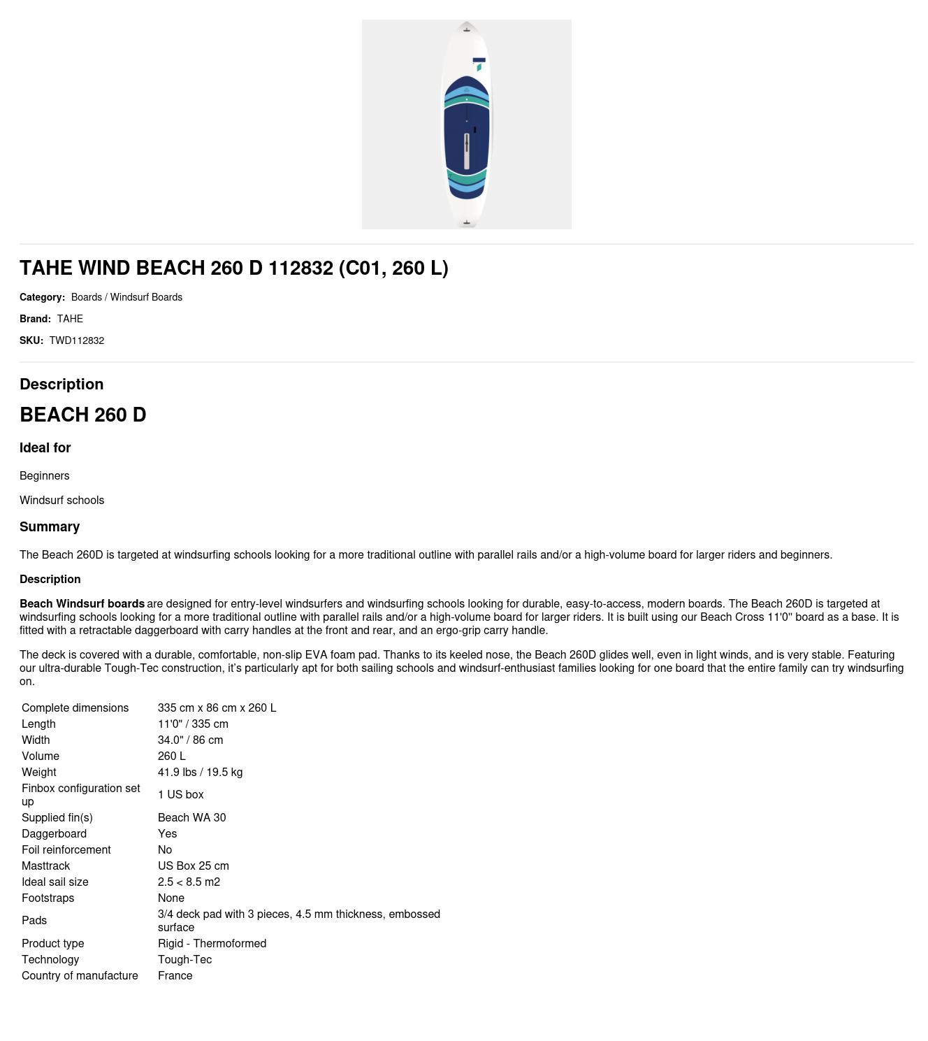 The Beach 260D is targeted at windsurfing schools looking for a more traditional outline with parallel rails and/or a high-volume board for larger riders and beginners.