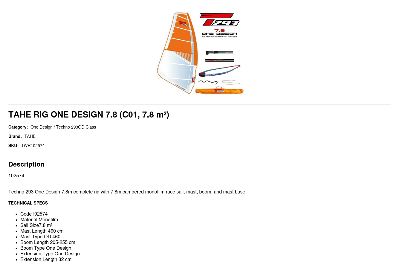 One Design rigs are the most widely used rigs in the world and are approved for Techno 293 OD competitions in the U15, U17, U19 and Techno Plus categories. Comes in a complete pack with sail, boom, mast, extension and footmast.