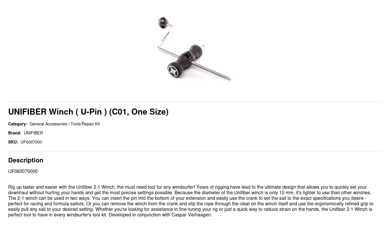 Rig up faster and easier with the Unifiber 2-1 Winch, the must need tool for any windsurfer! Years of rigging have lead to the ultimate design that allows you to quickly set your downhaul without hurting your hands and get the most precise settings possible. Because the diameter of the Unifiber winch is only 10 mm, it's lighter to use than other winches. The 2-1 winch can be used in two ways. You can insert the pin into the bottom of your extension and easily use the crank to set the sail to the exact specifications you desire - perfect for racing and formula sailors. Or you can remove the winch from the crank and slip the rope through the cleat on the winch itself and use the ergonomically refined grip to easily pull any sail to your desired setting. Whether you're looking for assistance in fine-tuning your rig or just a quick way to reduce strain on the hands, the Unifiber 2-1 Winch is perfect tool to have in every windsurfer's tool kit. Developed in conjunction with Caspar Verhaagen.