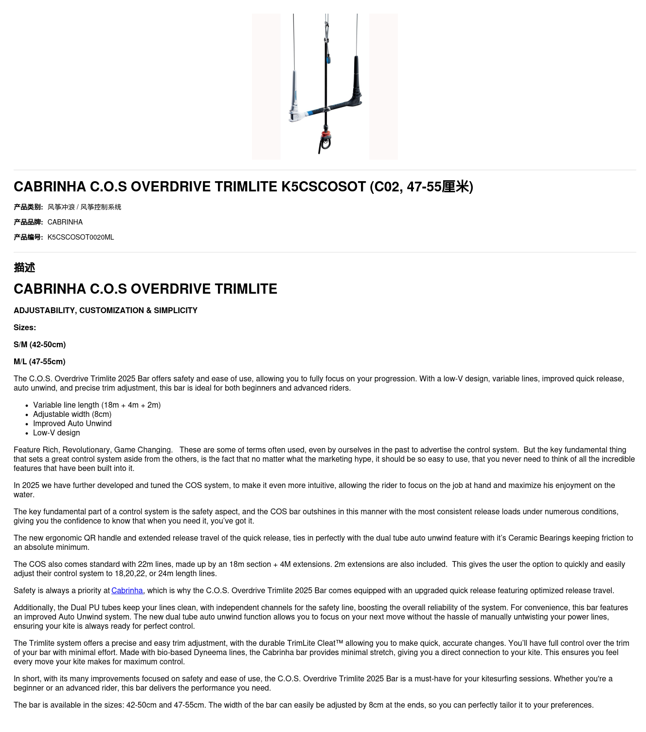 The C.O.S. Overdrive Trimlite 2025 Bar offers safety and ease of use, allowing you to fully focus on your progression. With a low-V design, variable lines, improved quick release, auto unwind, and precise trim adjustment, this bar is ideal for both beginners and advanced riders.