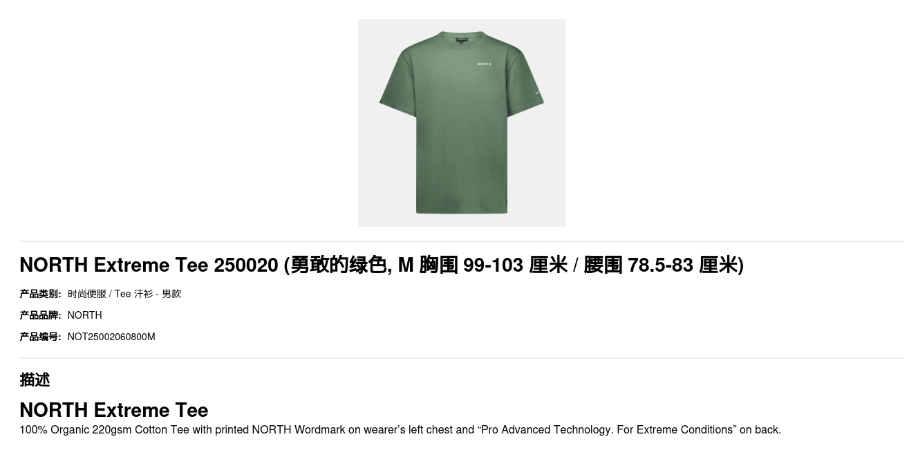 100% Organic 220gsm Cotton Tee with printed NORTH Wordmark on wearer’s left chest and “Pro Advanced Technology. For Extreme Conditions” on back.