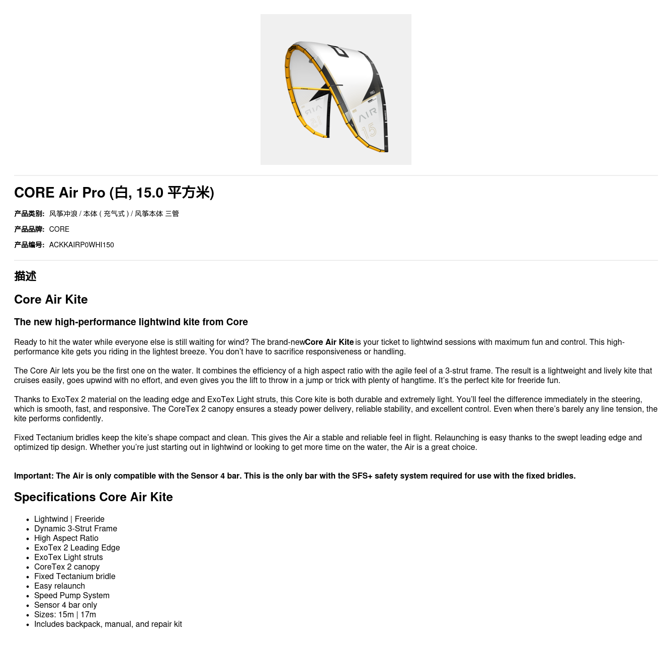 The Core Air lets you be the first one on the water. It combines the efficiency of a high aspect ratio with the agile feel of a 3-strut frame. The result is a lightweight and lively kite that cruises easily, goes upwind with no effort, and even gives you the lift to throw in a jump or trick with plenty of hangtime. It’s the perfect kite for freeride fun.