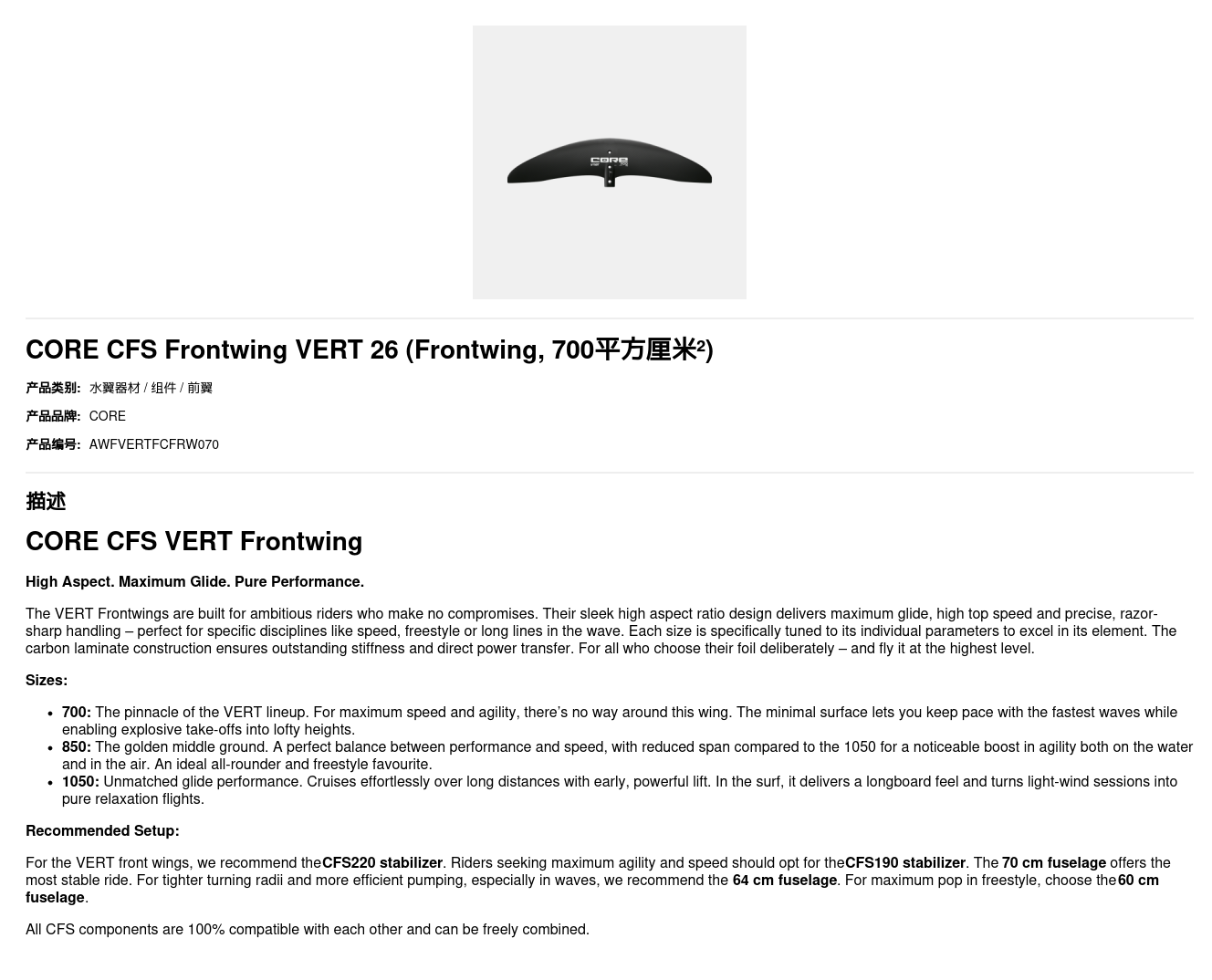 For the VERT front wings, we recommend the CFS220 stabilizer. Riders seeking maximum agility and speed should opt for the CFS190 stabilizer. The 70 cm fuselage offers the most stable ride. For tighter turning radii and more efficient pumping, especially in waves, we recommend the 64 cm fuselage. For maximum pop in freestyle, choose the 60 cm fuselage.