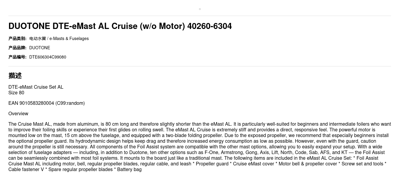 The Cruise Mast AL, made from aluminum, is 80 cm long and therefore slightly shorter than the eMast AL. It is particularly well-suited for beginners and intermediate foilers who want to improve their foiling skills or experience their first glides on rolling swell. The eMast AL Cruise is extremely stiff and provides a direct, responsive feel. The powerful motor is mounted low on the mast, 15 cm above the fuselage, and equipped with a two-blade folding propeller. Due to the exposed propeller, we recommend that especially beginners install the optional propeller guard. Its hydrodynamic design helps keep drag and therefore increased energy consumption as low as possible. However, even with the guard, caution around the propeller is still necessary. All components of the Foil Assist system are compatible with the other mast options, allowing you to easily expand your setup. With a wide selection of fuselage adapters — including, in addition to Duotone, ten other options such as F-One, Armstrong, Gong, Axis, Lift, North, Code, Sab, AFS, and KT — the Foil Assist can be seamlessly combined with most foil systems. It mounts to the board just like a traditional mast. The following items are included in the eMast AL Cruise Set: * Foil Assist Cruise Mast AL including motor, bell, regular propeller blades, regular cable, and leash * Propeller guard * Cruise eMast cover * Motor bell & propeller cover * Screw set and tools * Cable fastener V * Spare regular propeller blades * Battery bag