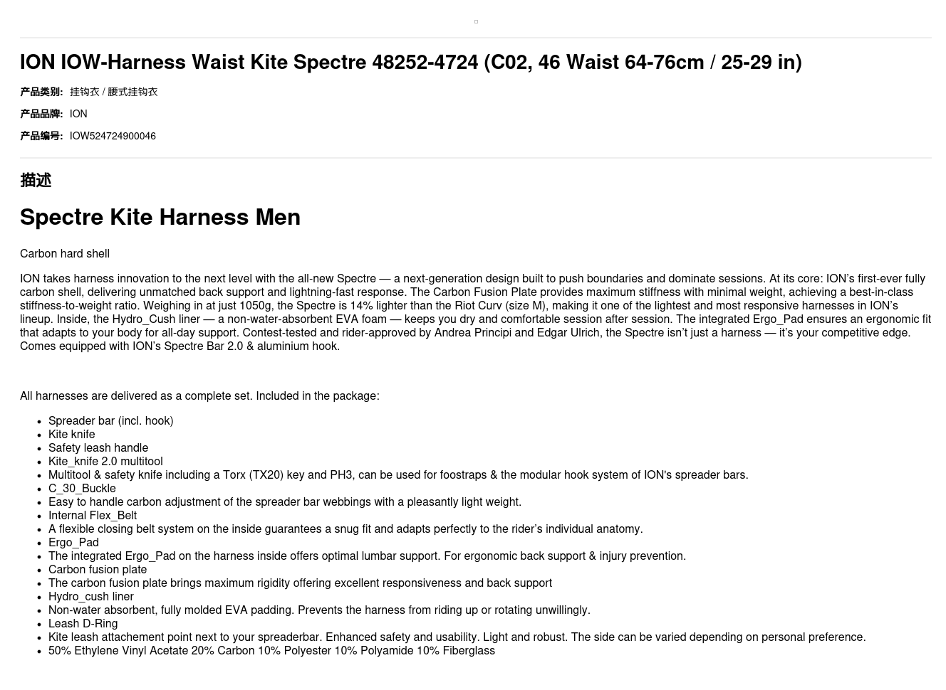 ION takes harness innovation to the next level with the all-new Spectre — a next-generation design built to push boundaries and dominate sessions. At its core: ION’s first-ever fully carbon shell, delivering unmatched back support and lightning-fast response. The Carbon Fusion Plate provides maximum stiffness with minimal weight, achieving a best-in-class stiffness-to-weight ratio. Weighing in at just 1050g, the Spectre is 14% lighter than the Riot Curv (size M), making it one of the lightest and most responsive harnesses in ION’s lineup. Inside, the Hydro_Cush liner — a non-water-absorbent EVA foam — keeps you dry and comfortable session after session. The integrated Ergo_Pad ensures an ergonomic fit that adapts to your body for all-day support. Contest-tested and rider-approved by Andrea Principi and Edgar Ulrich, the Spectre isn’t just a harness — it’s your competitive edge. Comes equipped with ION’s Spectre Bar 2.0 & aluminium hook.