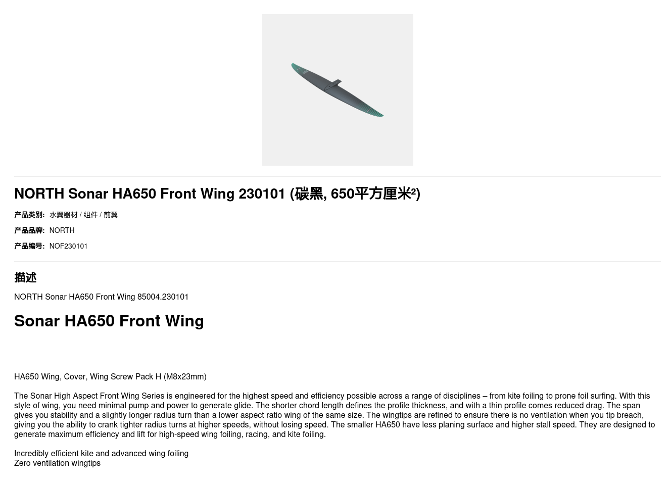 The Sonar High Aspect Front Wing Series is engineered for the highest speed and efficiency possible across a range of disciplines – from kite foiling to prone foil surfing. With this style of wing, you need minimal pump and power to generate glide. The shorter chord length defines the profile thickness, and with a thin profile comes reduced drag. The span gives you stability and a slightly longer radius turn than a lower aspect ratio wing of the same size. The wingtips are refined to ensure there is no ventilation when you tip breach, giving you the ability to crank tighter radius turns at higher speeds, without losing speed. The smaller HA650 have less planing surface and higher stall speed. They are designed to generate maximum efficiency and lift for high-speed wing foiling, racing, and kite foiling.