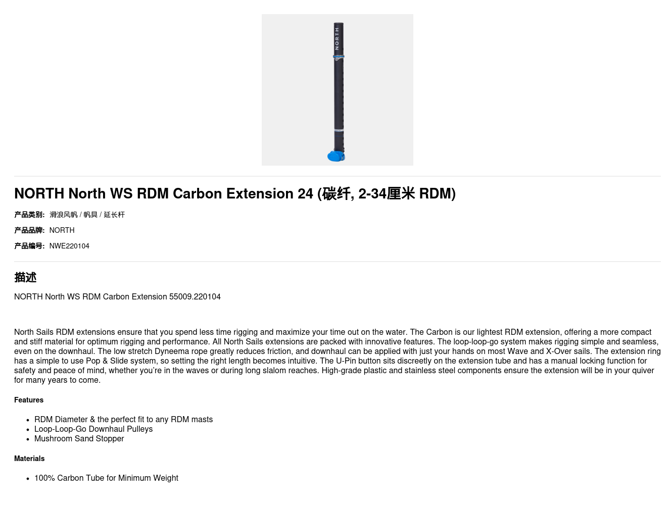 North Sails RDM extensions ensure that you spend less time rigging and maximize your time out on the water. The Carbon is our lightest RDM extension, offering a more compact and stiff material for optimum rigging and performance. All North Sails extensions are packed with innovative features. The loop-loop-go system makes rigging simple and seamless, even on the downhaul. The low stretch Dyneema rope greatly reduces friction, and downhaul can be applied with just your hands on most Wave and X-Over sails. The extension ring has a simple to use Pop & Slide system, so setting the right length becomes intuitive. The U-Pin button sits discreetly on the extension tube and has a manual locking function for safety and peace of mind, whether you’re in the waves or during long slalom reaches. High-grade plastic and stainless steel components ensure the extension will be in your quiver for many years to come.