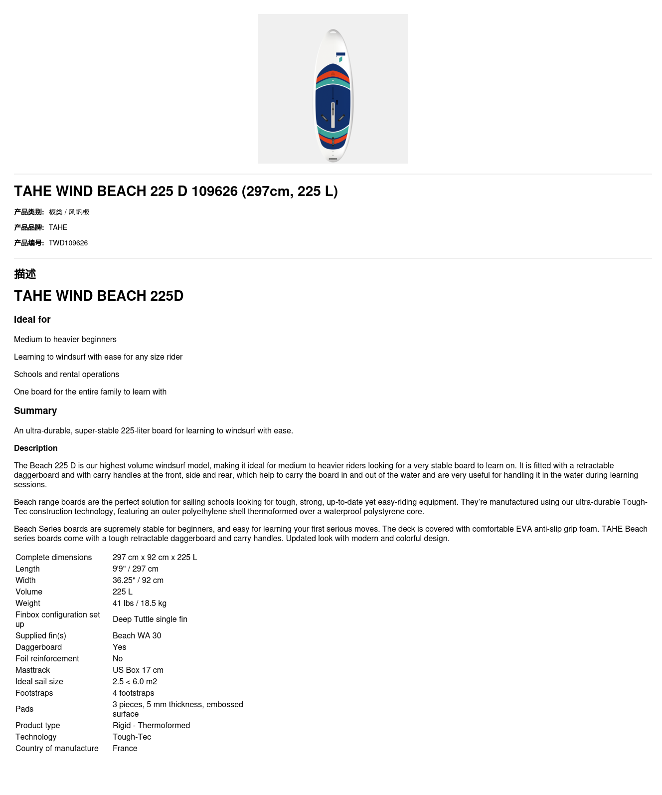 The Beach 225 D is our highest volume windsurf model, making it ideal for medium to heavier riders looking for a very stable board to learn on. It is fitted with a retractable daggerboard and with carry handles at the front, side and rear, which help to carry the board in and out of the water and are very useful for handling it in the water during learning sessions.
