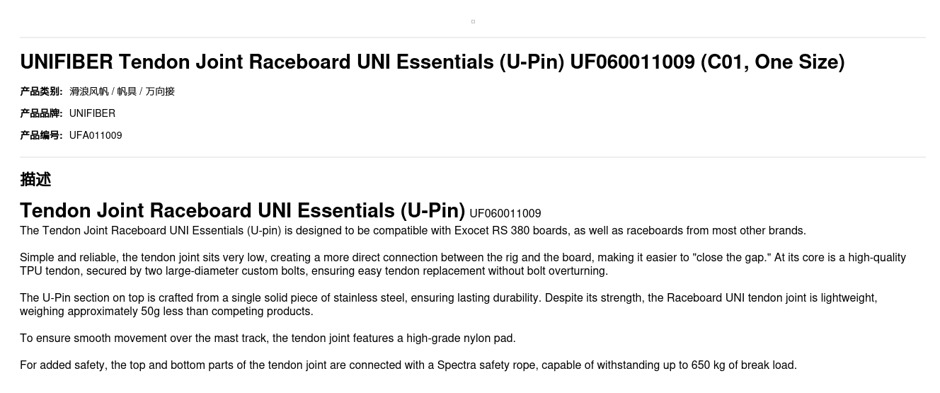 The Tendon Joint Raceboard UNI Essentials (U-pin) is designed to be compatible with Exocet RS 380 boards, as well as raceboards from most other brands.