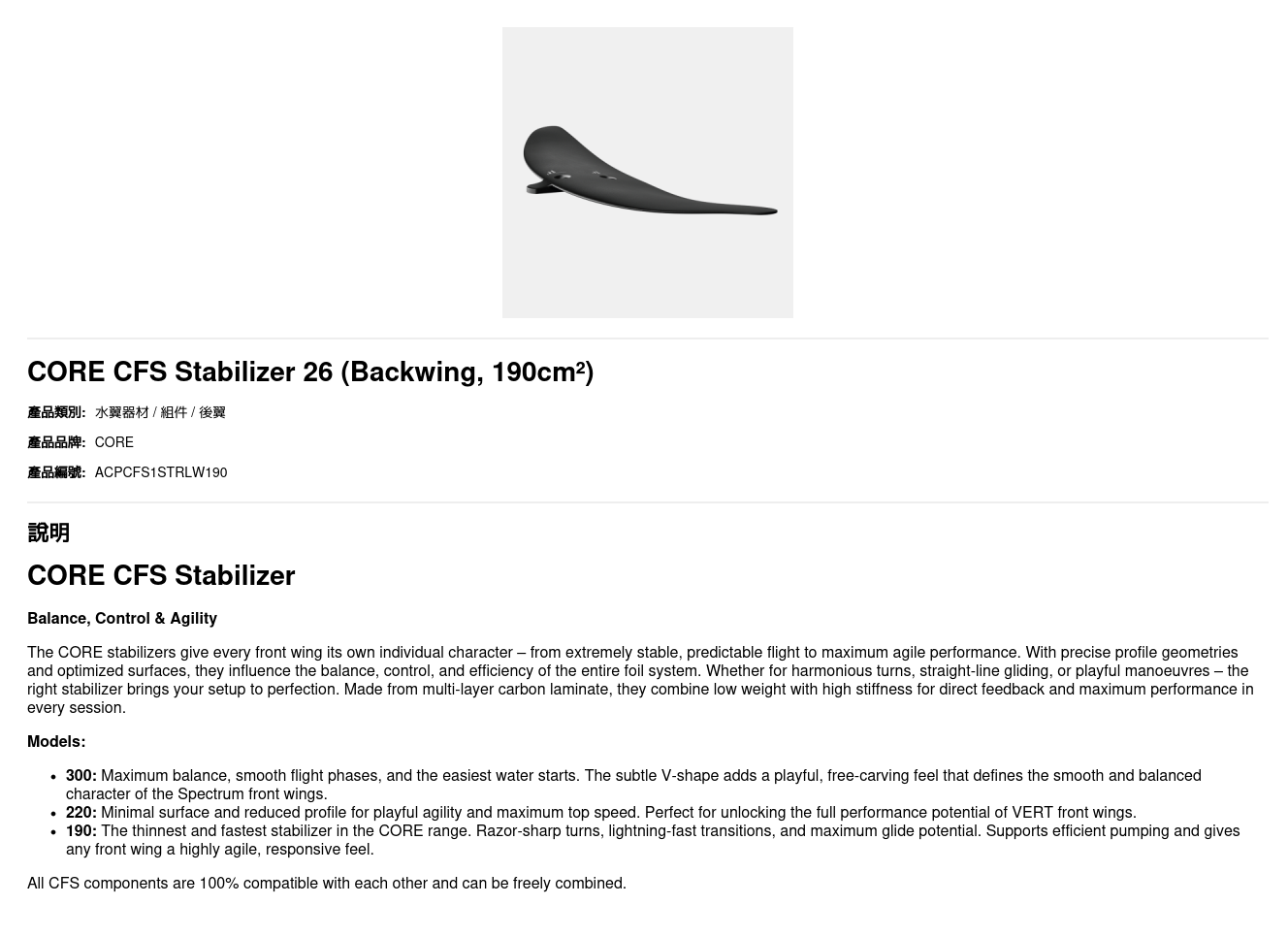 - 190: The thinnest and fastest stabilizer in the CORE range. Razor-sharp turns, lightning-fast transitions, and maximum glide potential. Supports efficient pumping and gives any front wing a highly agile, responsive feel.