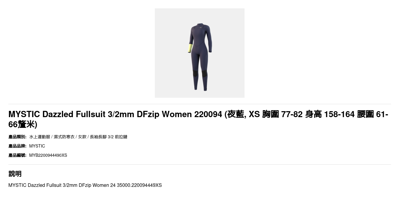 | 尺碼 | XS 胸圍 77-82 身高 158-164 腰圍 61-66釐米, S 胸圍 82-88 身高 163-169 腰圍 65-71釐米, M 胸圍 87-93 身高 164-172 腰圍 69-75釐米, L 胸圍 92-99 身高 170-175 腰圍 75-82釐米 |