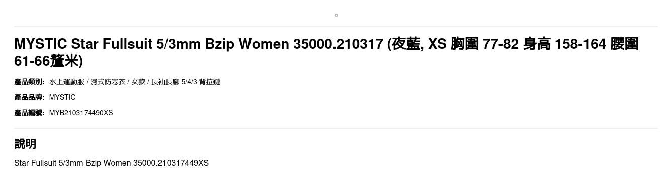 | 尺碼 | XS 胸圍 77-82 身高 158-164 腰圍 61-66釐米, S 胸圍 82-88 身高 163-169 腰圍 65-71釐米, M 胸圍 87-93 身高 164-172 腰圍 69-75釐米 |