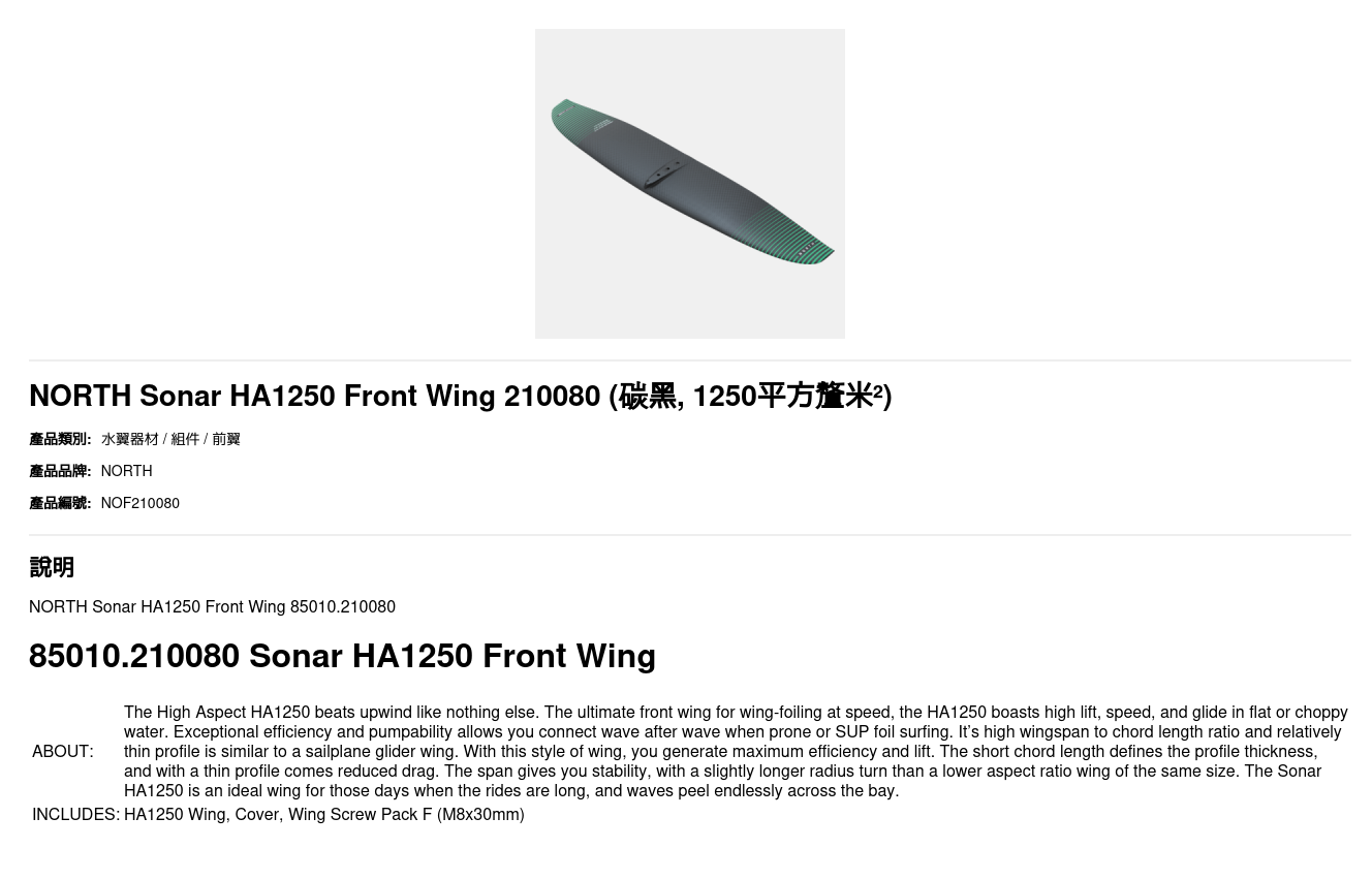 | ABOUT: | The High Aspect HA1250 beats upwind like nothing else. The ultimate front wing for wing-foiling at speed, the HA1250 boasts high lift, speed, and glide in flat or choppy water. Exceptional efficiency and pumpability allows you connect wave after wave when prone or SUP foil surfing. It’s high wingspan to chord length ratio and relatively thin profile is similar to a sailplane glider wing. With this style of wing, you generate maximum efficiency and lift. The short chord length defines the profile thickness, and with a thin profile comes reduced drag. The span gives you stability, with a slightly longer radius turn than a lower aspect ratio wing of the same size. The Sonar HA1250 is an ideal wing for those days when the rides are long, and waves peel endlessly across the bay. |