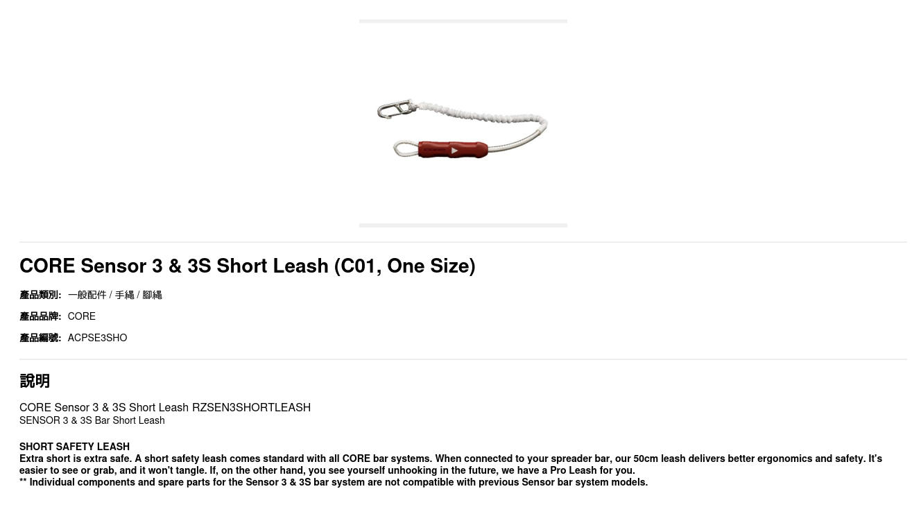 SHORT SAFETY LEASHExtra short is extra safe. A short safety leash comes standard with all CORE bar systems. When connected to your spreader bar, our 50cm leash delivers better ergonomics and safety. It's easier to see or grab, and it won't tangle. If, on the other hand, you see yourself unhooking in the future, we have a Pro Leash for you.** Individual components and spare parts for the Sensor 3 & 3S bar system are not compatible with previous Sensor bar system models.