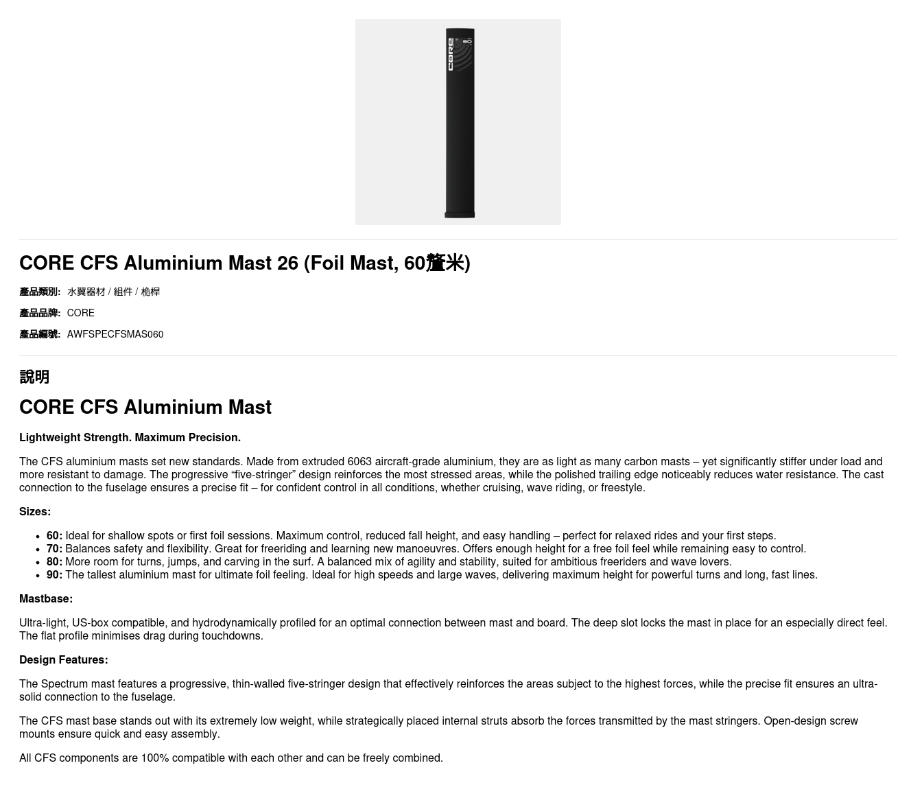 - 90: The tallest aluminium mast for ultimate foil feeling. Ideal for high speeds and large waves, delivering maximum height for powerful turns and long, fast lines.