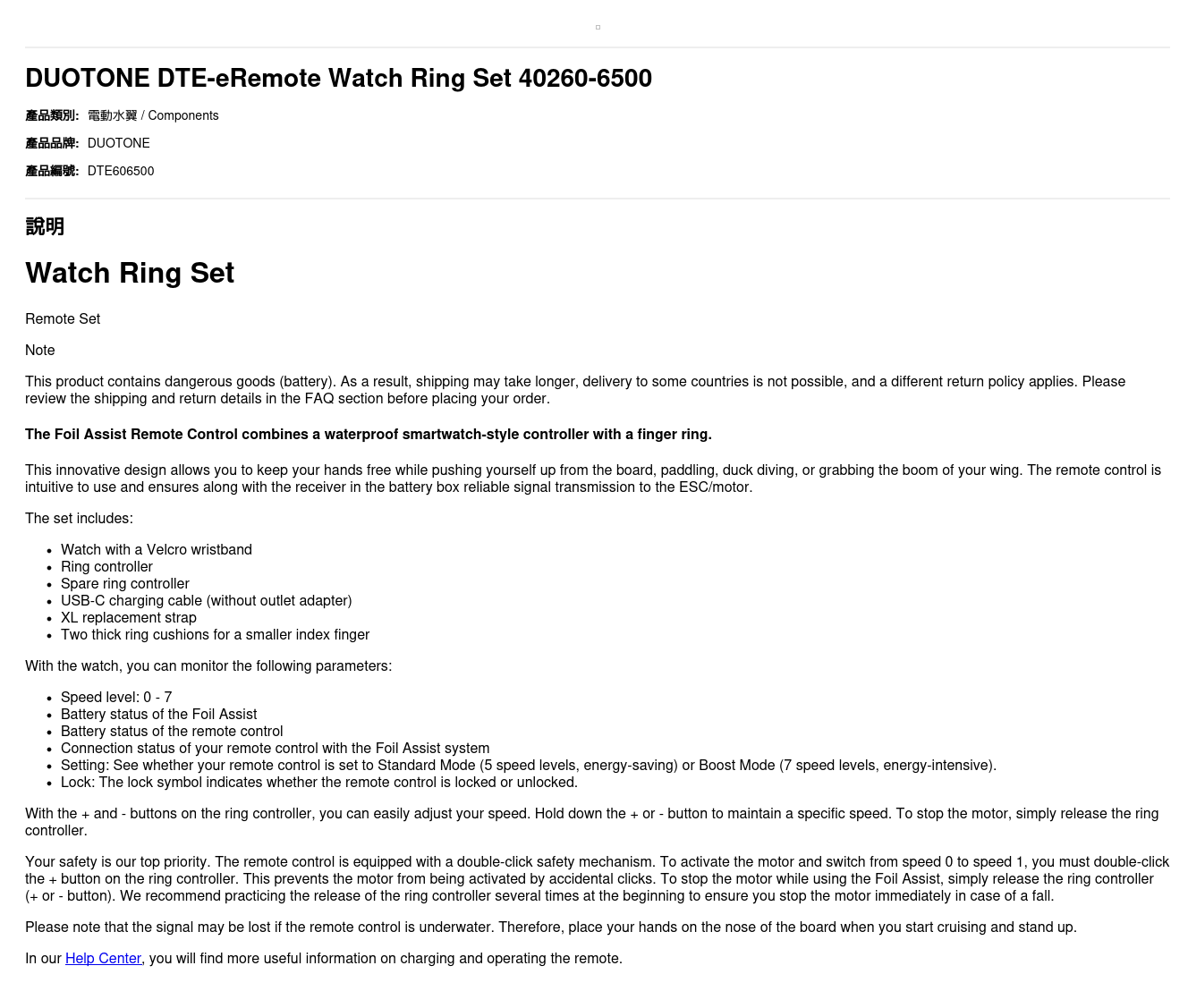 Your safety is our top priority. The remote control is equipped with a double-click safety mechanism. To activate the motor and switch from speed 0 to speed 1, you must double-click the + button on the ring controller. This prevents the motor from being activated by accidental clicks. To stop the motor while using the Foil Assist, simply release the ring controller (+ or - button). We recommend practicing the release of the ring controller several times at the beginning to ensure you stop the motor immediately in case of a fall.