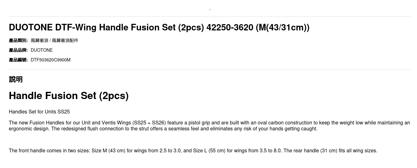 The front handle comes in two sizes: Size M (43 cm) for wings from 2.5 to 3.0, and Size L (55 cm) for wings from 3.5 to 8.0. The rear handle (31 cm) fits all wing sizes.