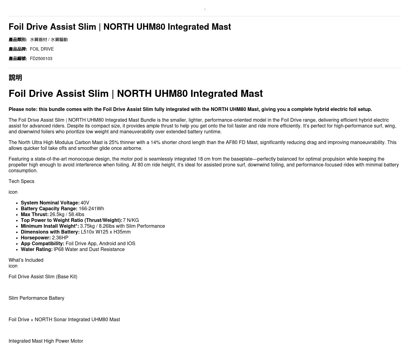 Please note: this bundle comes with the Foil Drive Assist Slim fully integrated with the NORTH UHM80 Mast, giving you a complete hybrid electric foil setup.
