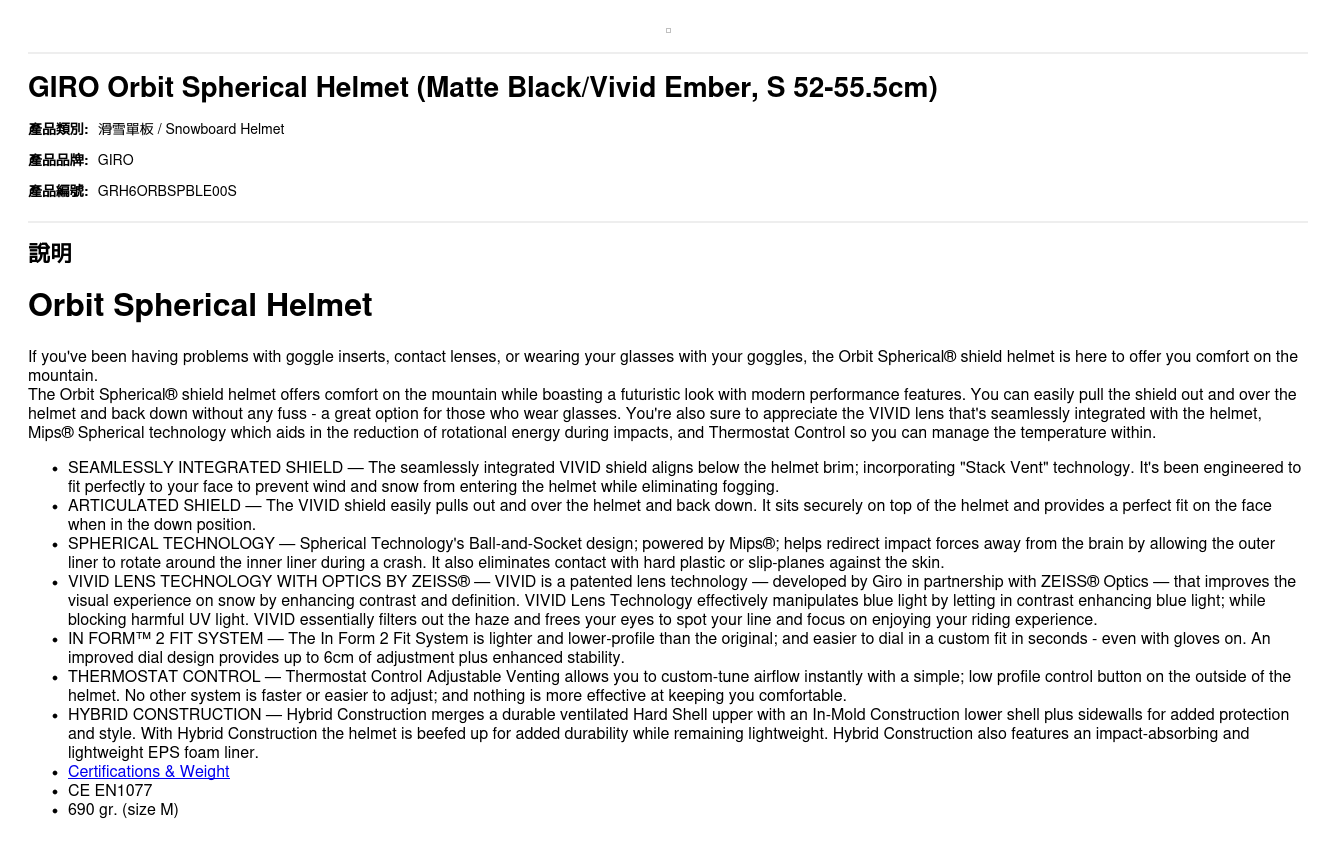 | 尺碼 | S 52-55.5cm, M 55.5-59cm, L 59-62.5cm |