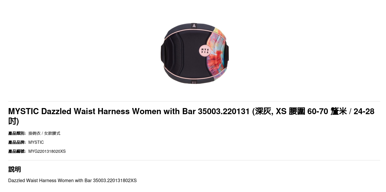 | 尺碼 | XS 腰圍 60-70 釐米 / 24-28 吋, S 腰圍 68-76 釐米 / 27-30 吋, M 腰圍 74-84 釐米 / 29-33 吋 |