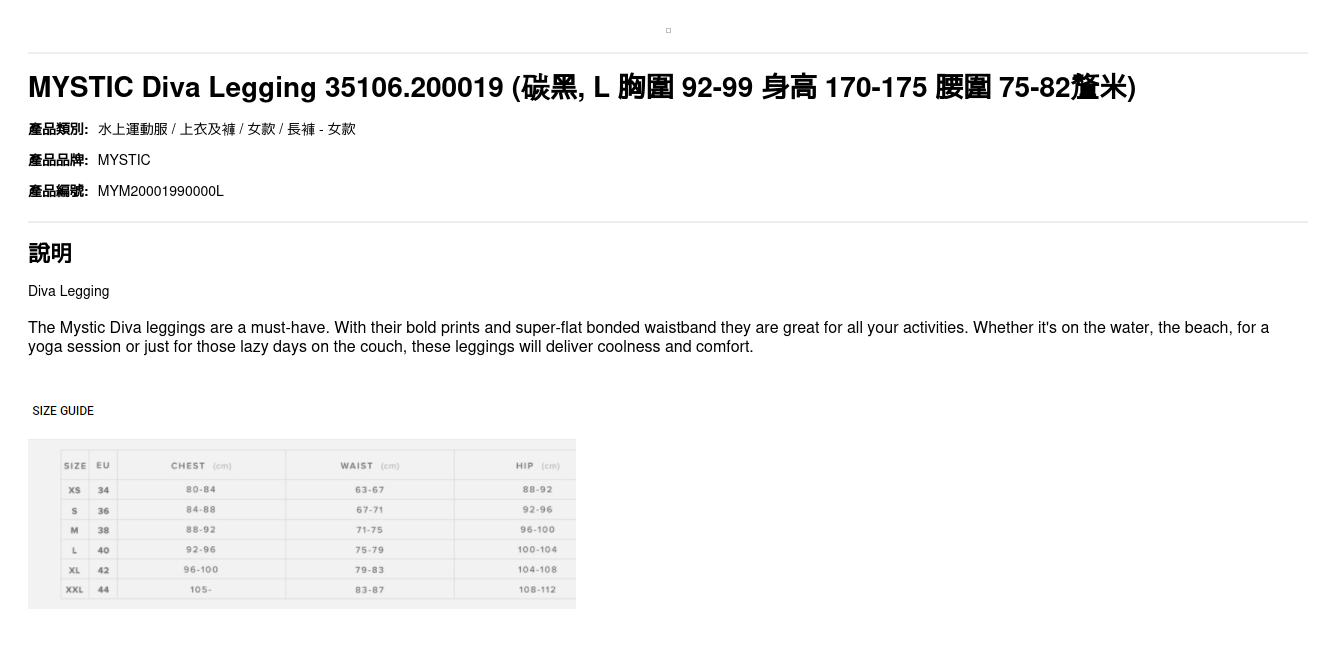 | 尺碼 | XS 胸圍 77-82 身高 158-164 腰圍 61-66釐米, S 胸圍 82-88 身高 163-169 腰圍 65-71釐米, M 胸圍 87-93 身高 164-172 腰圍 69-75釐米, L 胸圍 92-99 身高 170-175 腰圍 75-82釐米 |