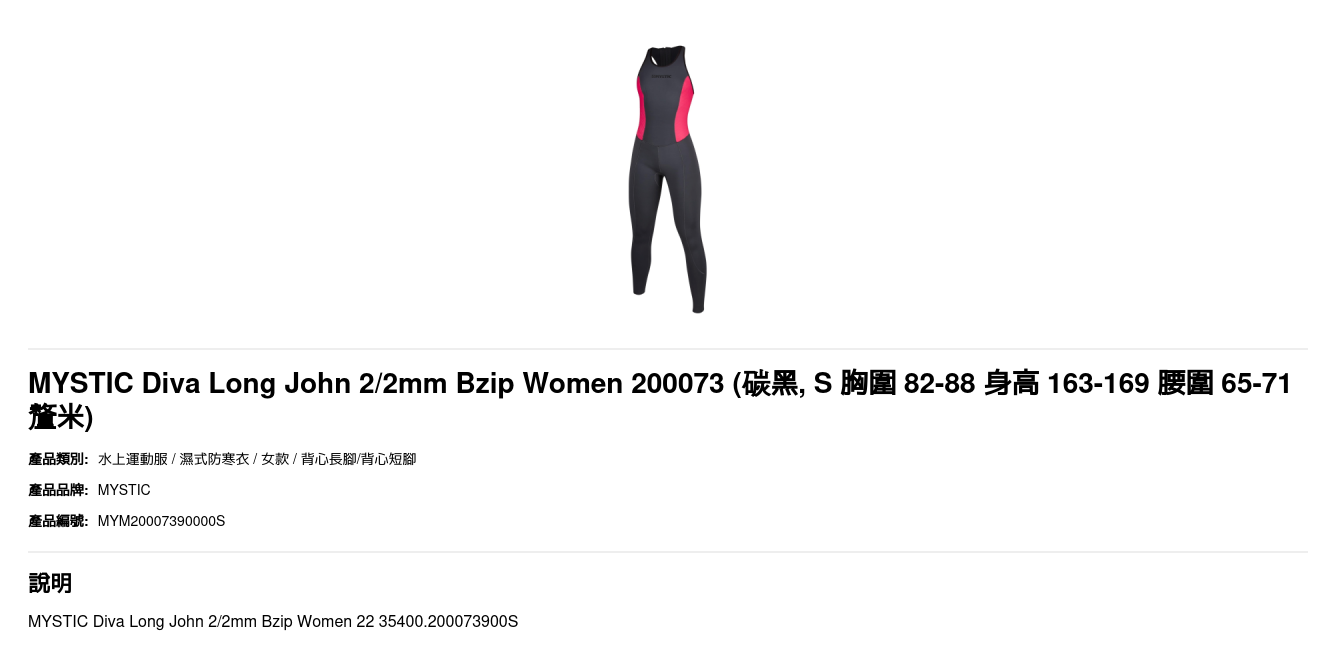| 尺碼 | S 胸圍 82-88 身高 163-169 腰圍 65-71釐米, M 胸圍 87-93 身高 164-172 腰圍 69-75釐米 |