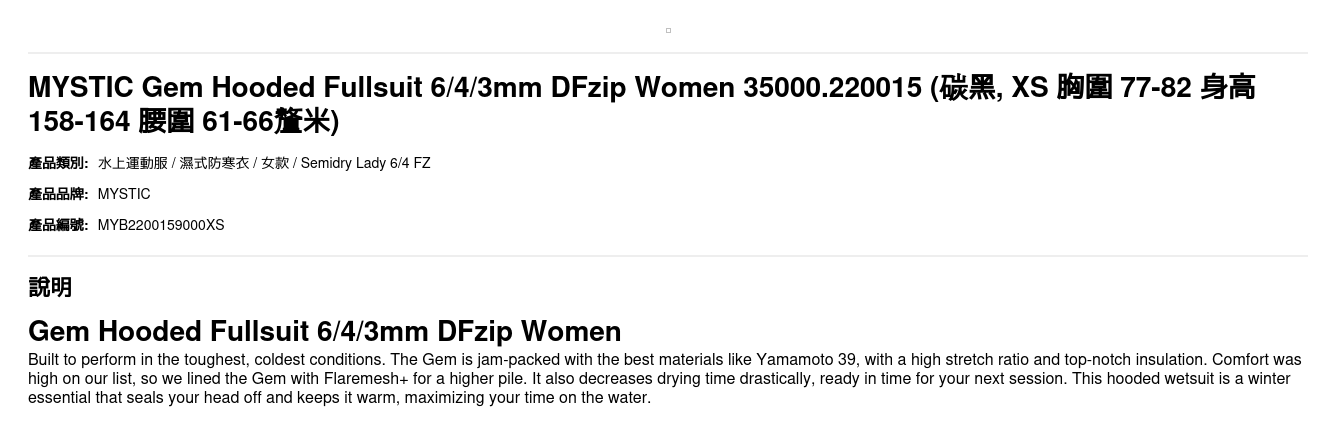 | 尺碼 | XS 胸圍 77-82 身高 158-164 腰圍 61-66釐米, S 胸圍 82-88 身高 163-169 腰圍 65-71釐米, M 胸圍 87-93 身高 164-172 腰圍 69-75釐米 |