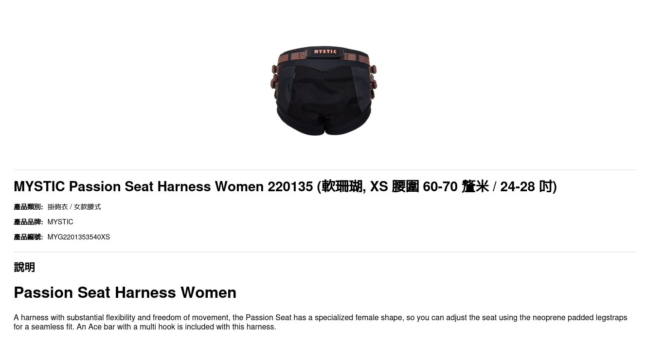 | 尺碼 | XS 腰圍 60-70 釐米 / 24-28 吋, S 腰圍 68-76 釐米 / 27-30 吋, M 腰圍 74-84 釐米 / 29-33 吋, L 腰圍 82-94 釐米 / 32-37 吋 |