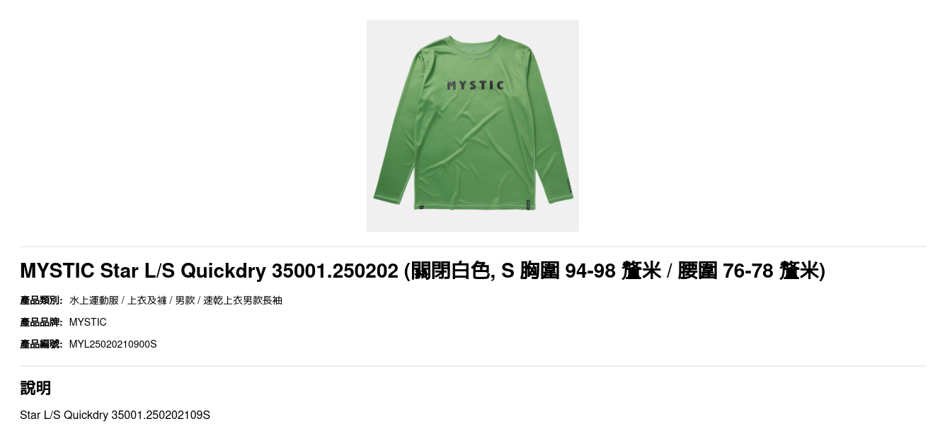 | 尺碼 | S 胸圍 94-98 釐米 / 腰圍 76-78 釐米, M 胸圍 99-103 釐米 / 腰圍 78.5-83 釐米, L 胸圍 104-108 釐米 / 腰圍 83.5-88 釐米, XL 胸圍 109-114 釐米 / 腰圍 91-93.5 釐米 |