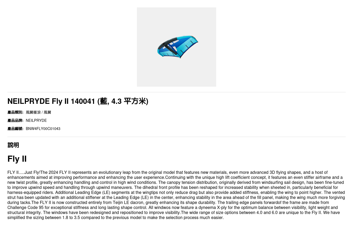 FLY II.....Just Fly!The 2024 FLY II represents an evolutionary leap from the original model that features new materials, even more advanced 3D flying shapes, and a host of enhancements aimed at improving performance and enhancing the user experience.Continuing with the unique high lift coefficient concept, it features an even stiffer airframe and a new twist profile, greatly enhancing handling and control in high wind conditions. The canopy tension distribution, originally derived from windsurfing sail design, has been fine-tuned to improve upwind speed and handling through upwind maneuvers. The dihedral front profile has been reshaped for increased stability when sheeted in, particularly beneficial for harness-equipped riders. Additional Leading Edge (LE) segments at the wingtips not only reduce drag but also provide added stiffness, enabling the wing to point higher. The vented strut has been updated with an additional stiffener at the Leading Edge (LE) in the center, enhancing stability in the area ahead of the fill panel, making the wing much more forgiving during tacks.The FLY II is now constructed entirely from Teijin LE dacron, greatly enhancing its shape durability. The trailing edge panels forwardof the frame are made from Challenge Code 95 for exceptional stiffness and long lasting shape control. All windwos now feature a dyneema X-ply for the optimum balance between visibility, light weight and structural integrity. The windows have been redesigned and repositioned to improve visibility.The wide range of size options between 4.0 and 6.0 are unique to the Fly II. We have simplified the sizing between 1.8 to 3.5 compared to the previous model to make the selection process much easier.