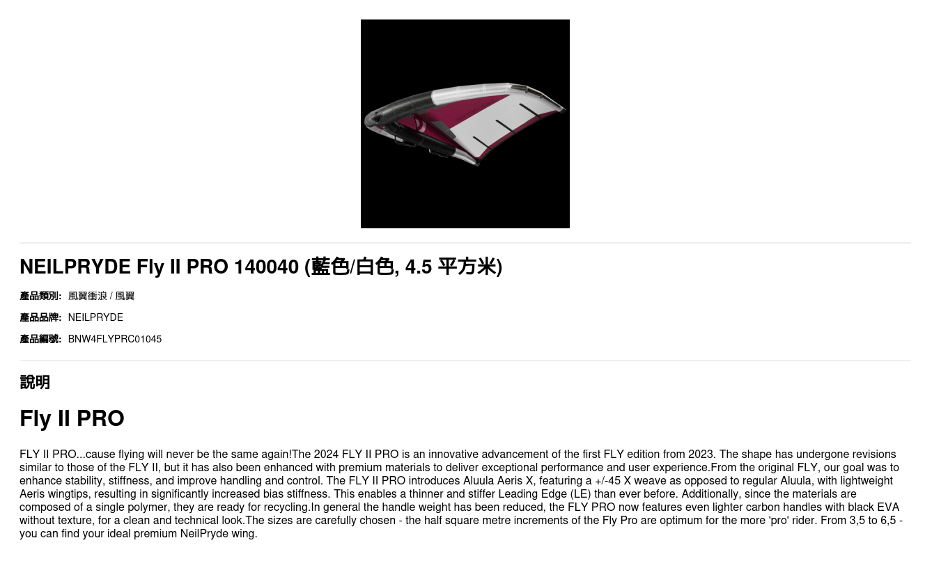 FLY II PRO...cause flying will never be the same again!The 2024 FLY II PRO is an innovative advancement of the first FLY edition from 2023. The shape has undergone revisions similar to those of the FLY II, but it has also been enhanced with premium materials to deliver exceptional performance and user experience.From the original FLY, our goal was to enhance stability, stiffness, and improve handling and control. The FLY II PRO introduces Aluula Aeris X, featuring a +/-45 X weave as opposed to regular Aluula, with lightweight Aeris wingtips, resulting in significantly increased bias stiffness. This enables a thinner and stiffer Leading Edge (LE) than ever before. Additionally, since the materials are composed of a single polymer, they are ready for recycling.In general the handle weight has been reduced, the FLY PRO now features even lighter carbon handles with black EVA without texture, for a clean and technical look.The sizes are carefully chosen - the half square metre increments of the Fly Pro are optimum for the more 'pro' rider. From 3,5 to 6,5 - you can find your ideal premium NeilPryde wing.