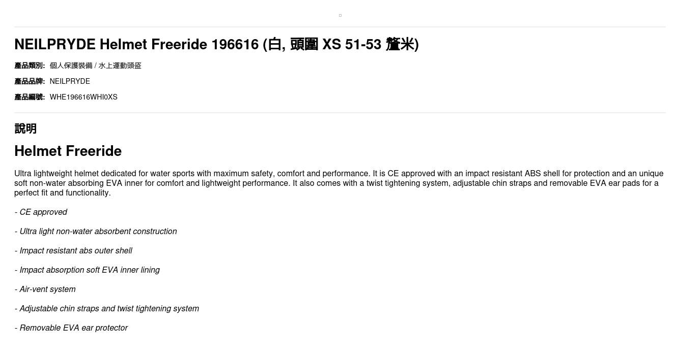 | 尺碼 | 頭圍 XS 51-53 釐米, 頭圍 S 54-56 釐米, 頭圍 M 56-58 釐米, 頭圍公升 58-60 釐米, 頭圍 XL 59-62 釐米 |